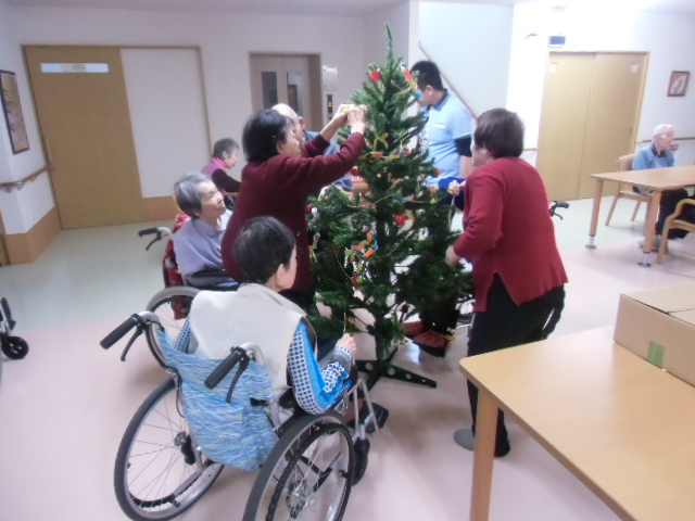 今年も恒例のクリスマスツリーを飾る時が来ました。 入居者様達は、「この飾りはここにしようか」とか、色々お話をしながらみんなで一緒に楽しく飾り付けが出来ました。 また、小さなお客様が大きなクリスマスツリーを見て、すごく喜んでらっしゃいました。 セカンドライフ飾西にお越しの際は、ぜひご覧ください。