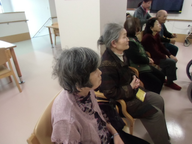 今日は、1号館の音楽療法の日です。 入居者様達は、「早春賊」や「汽車ぽっぽ」などの歌に合わせて腕を上げたり、手をたたいたりと、元気に楽しく参加されていました。 本当に毎週楽しみに待ってらっしゃいます。 中川先生ありがとうございます。 来週もよろしくお願いいたします。