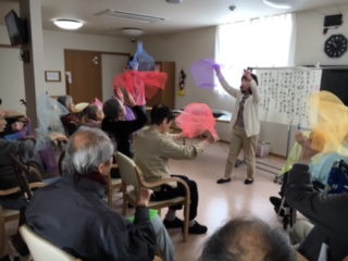 今日は、3号館での音楽療法の日です。 入居者様達今日も心待ちされていたようで、早くから待たれていました。 今日は、きれいなリボンを使って「ちょうちょ」を歌ったりしました。 またリクエスト曲を全員で歌われたりして、すごく楽しんでらっしゃいました。 先生、早々にリクエストにこたえてくださり有難うございます。 また来週もよろしくお願いいたします。