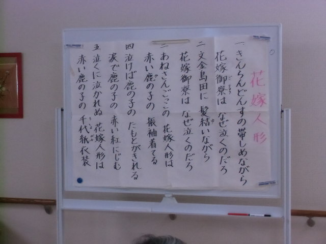 今日は1号館の音楽療法の日です。 今日は、「花嫁人形」などの歌を、入居者様達も懐かしそうに当時を思い出しながら歌われていました。 中川先生いつも色んな歌をありがとうございます。 来週もよろしくお願いいたします。