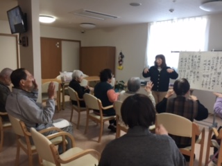 今日は、3号館での音楽療法の日です。 今日は「いい湯だな」や「ずいずいずっころばし」などを、手を使ったりして楽しくうたっておられました。 来週はまた入居者様のリクエスト曲があるようで、楽しみにされていました。 中川先生来週もよろしくお願いいたします。
