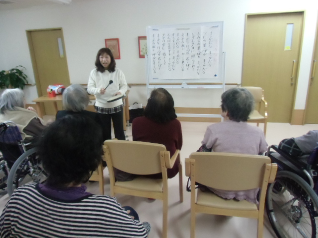 今日は1号館での音楽療法の日です。 今日は、入居者様のリクエストで「高校3年生」を懐かしみながら歌われていました。 また、12月という事で今日はベルを使ってクリスマスソングを歌われていました。 中川先生次回もよろしくお願いいたします。