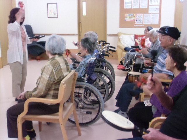 今日は1号館での音楽療法の日です。 太鼓や鳴子・鈴などを使って楽しく演奏を楽しまれていました。 中川先生来週も楽しみにしています。 よろしくお願いいたします。