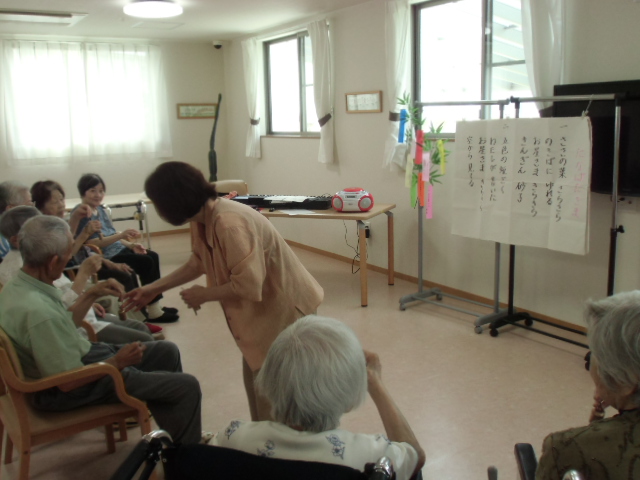 今日は3号館で音楽療法がありました。 「たなばたさま」や、「東京音頭」などを 太鼓や鈴、鳴子などを使ってリズムをとりながら 楽しく歌われていました。 中川先生、来週も宜しくお願い致します。