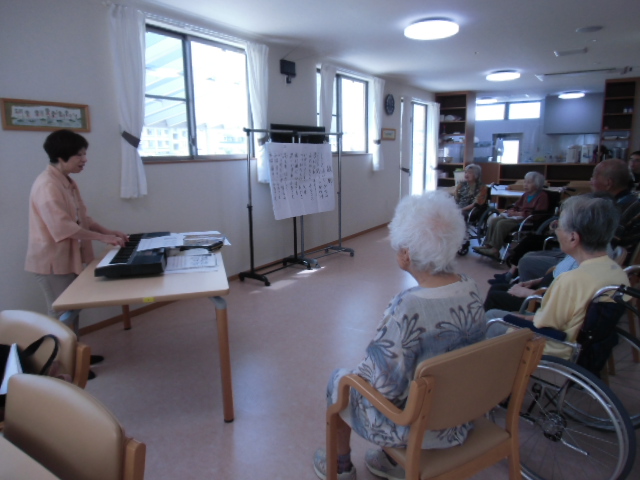 今日は2号館で音楽療法がありました。 「故郷」、「隣組」、「ラバウル小唄」などを 太鼓や鈴、鳴子などを使ってリズムをとりながら 楽しく歌われていました。 中川先生、暑い中ありがとうございました。 来週も宜しくお願い致します。
