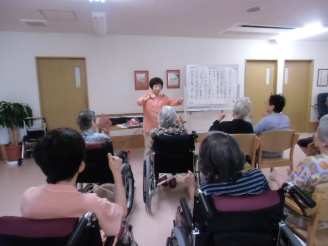 今日は1号館で音楽療法がありました。 「花火」、「魚屋さん」などを 太鼓や鈴、鳴子などを使ってリズムをとりながら 楽しく歌われていました。 中川先生、暑い中ありがとうございました。 来週も宜しくお願い致します。