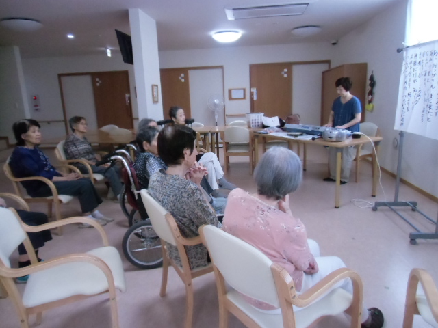 今日は3号館で音楽療法がありました。 「夏の思い出」、「金魚の昼寝」、「岸壁の母」などを 太鼓や鈴、鳴子などを使ってリズムをとりながら 楽しく歌われていました。 中川先生、暑い中ありがとうございました。 来週も宜しくお願い致します。