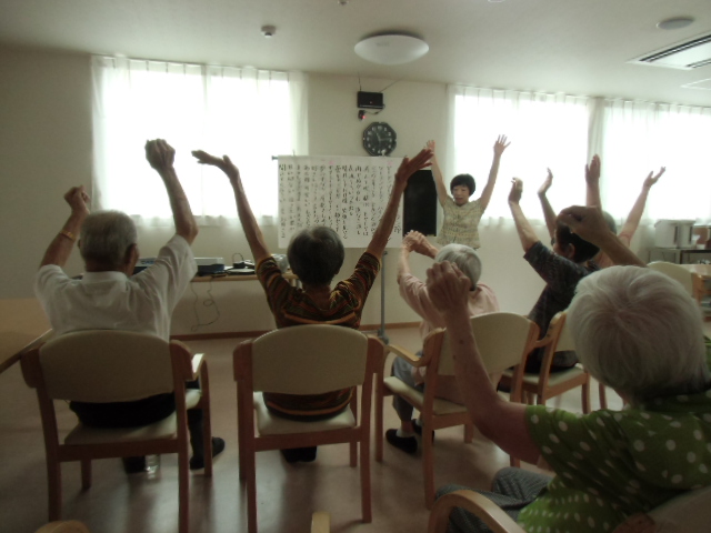 今日は3号館で音楽療法がありました。 「とんぼのめがめ」、「きよしのソーラン節」などを 太鼓や鈴、鳴子などを使ってリズムをとりながら 楽しく歌われていました。 中川先生、暑い中ありがとうございました。 来週も宜しくお願い致します。