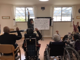 今日は、2号館での音楽療法です。 「汽車」や「どんぐりコロコロ」などをリズムに合わせて、 手や足を動かして楽しまれていました。 中川先生来週も楽しみにしています。