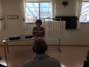 今日は2号館の音楽療法の日です。 北酒場、ソーラン節、およげ!たいやきくんなどを歌い、運動されました。 寒さが感じられないほど熱中しておられましたね! 中川先生、いつもありがとうございます。