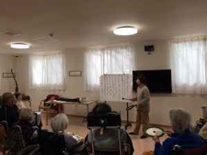 今日は2号館の音楽療法の日でした。 「たき火」「北の宿から」「ソーラン節」など季節を感じたり、体が温かくなるような歌を皆さんで歌って体を動かし、楽しまれています。 中川先生寒い中ありがとうございます。