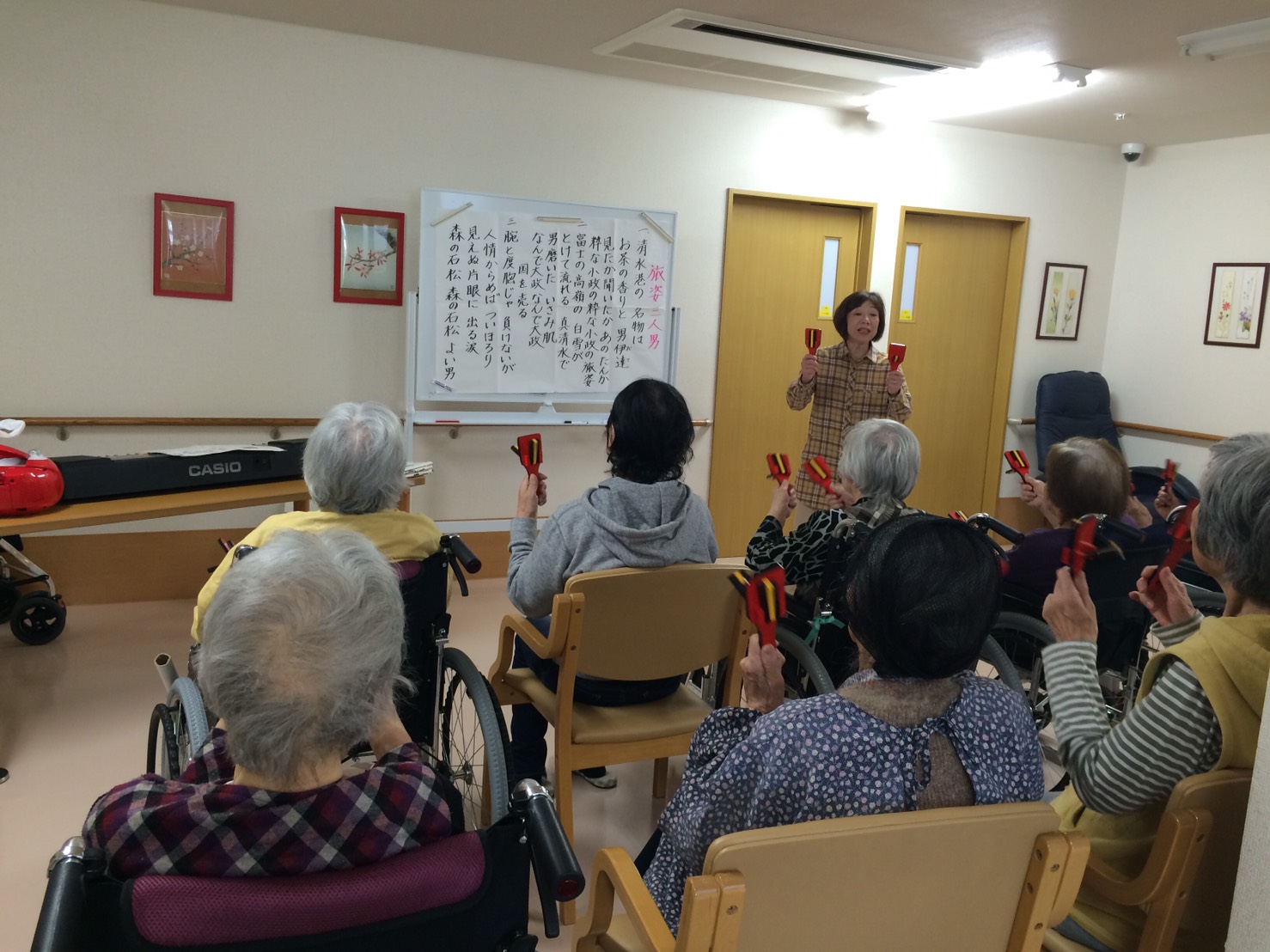 今日は1号館での音楽療法の日です。 「春の唄」や「有楽町で逢いましょう」など懐かしみながら、 リズムに合わせて歌ったり、鳴子を使ったりと 楽しまれていました。 中川先生来週も宜しくお願いします。