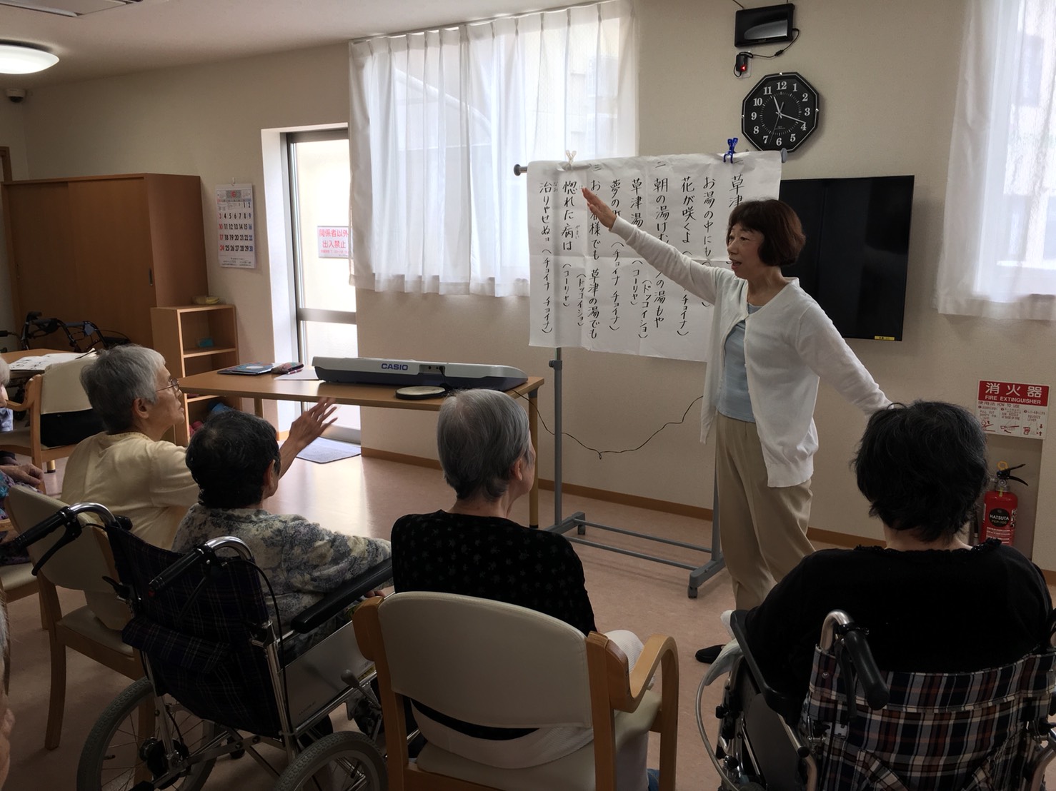 今日は3号館での音楽療法の日です。 「草津節」や「あめふり」など、歌ったり手遊びをしたりと 楽しまれていました。 中川先生来週も宜しくお願いします。