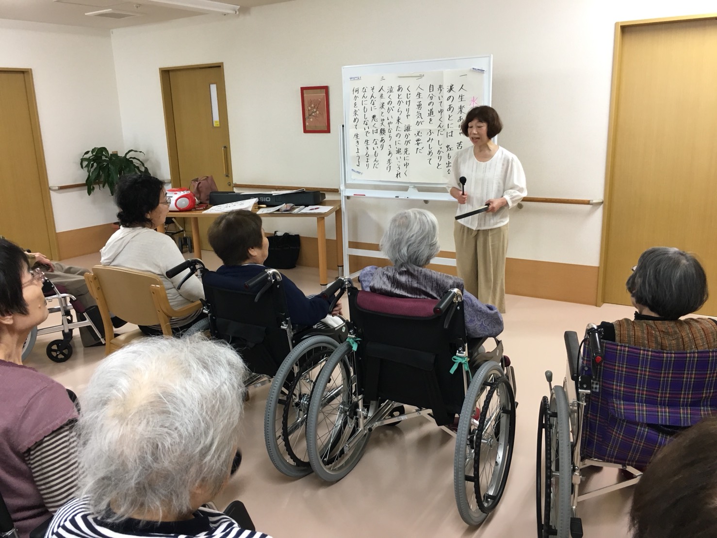 今日は1号館での音楽療法の日です。 「くちなしの花」や「水戸黄門」など楽しく、懐かしみながら歌われていました。 中川先生、来週も宜しくお願いします。