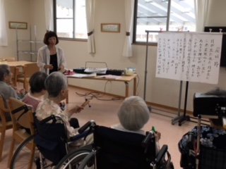 今日は2号館での音楽療法の日です。 先週お休みだったため、入居者様達は心待ちにしていたようです。 「赤とんぼ」や「ウサギのダンス」や「月がとっても青いから」など 手足を動かしたり、鈴などを使ったりして楽しまれていました。 中川先生来週も楽しみにしています。 いつもありがとうございます!!