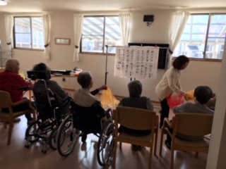 今日は2号館での音楽療法の日です。 「もみじ」や「港町十三番地」など歌ったり、きれいな布を使ったりして、 楽しまれていました。 中川先生来週も宜しくお願いします。