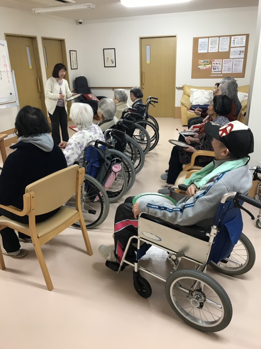 今日は1号館での音楽療法の日です。 「大黒様」や「雪の降る街を」など季節に合った歌を 楽しく歌ったり楽器を使ったりして楽しまれていました。 中川先生今年もよろしくお願いします。