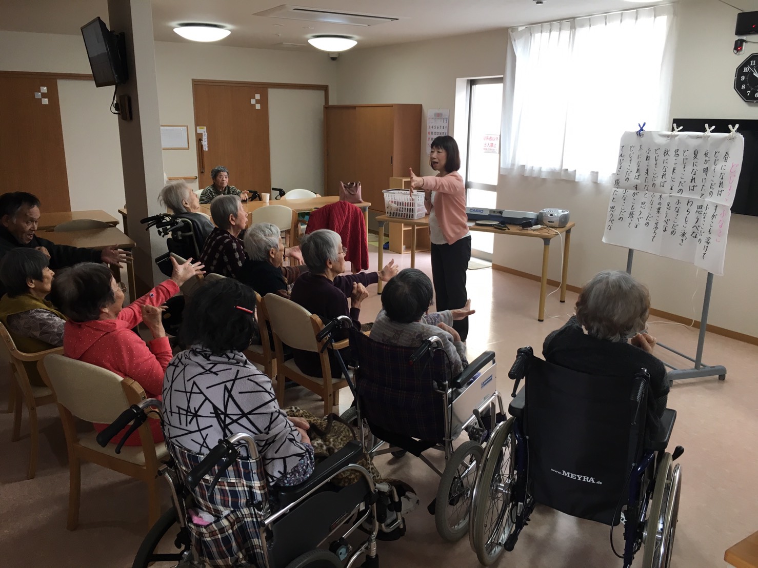 今日は、3号館での音楽療法の日です。 「どじょっこ ふなっこ」や「三百六十五歩のマーチ」など 太鼓や鈴などでリズムをとり楽しまれていました。 中川先生来週もよろしくお願いします。