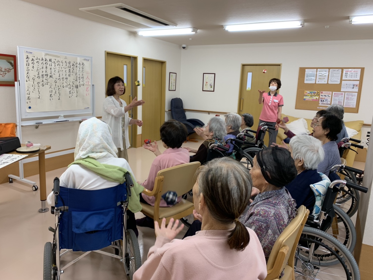 今日は1号館での音楽療法の日です。 「二人は若い」や「水戸黄門」など楽しく歌われていました。 中川先生来週もよろしくお願いします。
