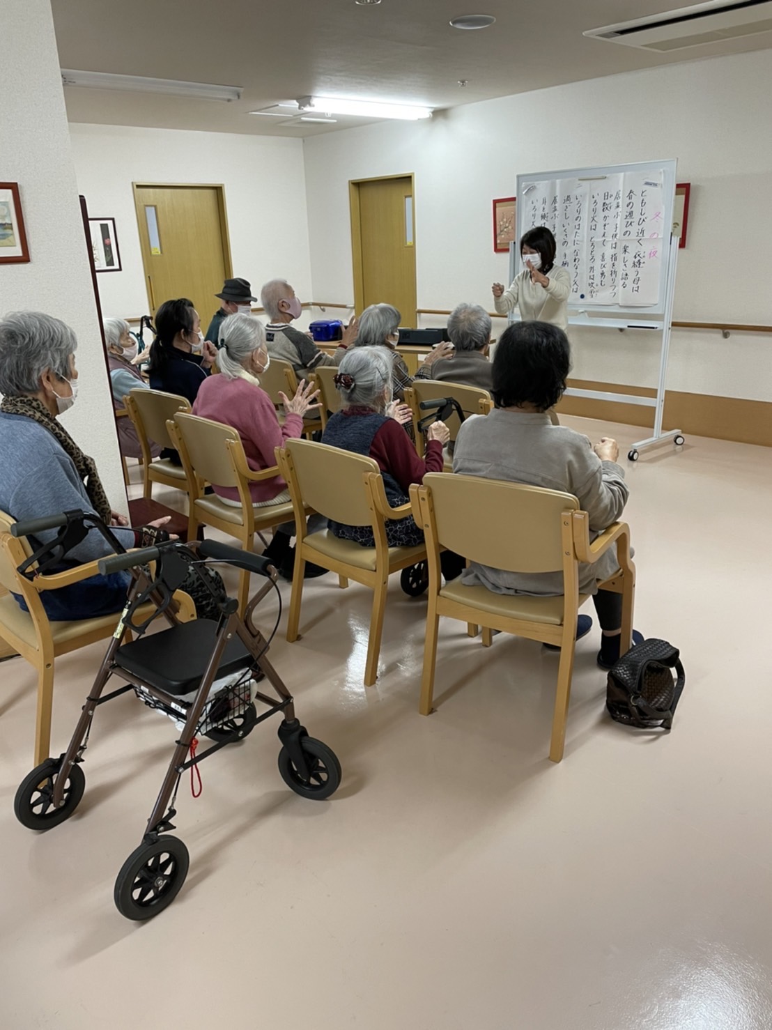 1号館での音楽療法 「冬の夜」や「南国土佐を後にして」など 懐かしい歌を歌いながらリズムに合わせて体も動かされていました 皆さん毎週楽しみにされています 来週も中川先生よろしくお願いします