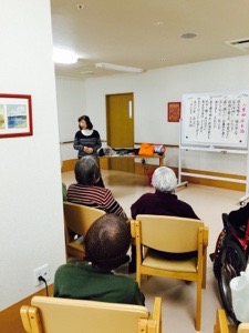 昨日は音楽療法がありました。 人生の並木道などを歌われたり、日本の四季のあらましなどについてお話をしてくださり、入居者様も聞き入っておられました。 いつもその歌の背景や逸話などを織り交ぜて楽しく進行してくださるので、皆様に大変人気です。