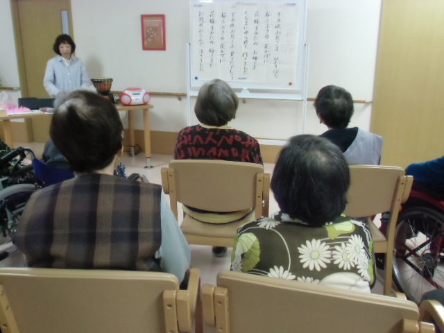 本日は音楽療法の日です。 皆さん、「花かげ」や「サザエさん」など、懐かしい歌を歌ったり、手や鳴子でリズムをとったりと、楽しく参加されていました.。