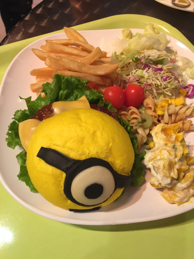 関係者の方から写真をいただきました。 USJの中にあるレストランだそうです。 映画にあった「ミニオンズ」のキャラクターミニオンのハンバーガーがとても可愛らしいです。 子供・大人も大喜びになりそうですね。USJに行かれた時は、是非ミニオンのレストランに行ってみてください。
