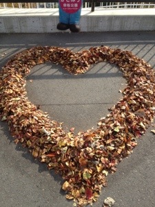 落ち葉でハート! 考え方でえらい違い!、ハイセンスに感動^_^ 落ち葉も芸術か! 凄い^_^ どうしたら、こんな発想になるのかな? 落ち葉はごみとしか思えない自分が悲しい。